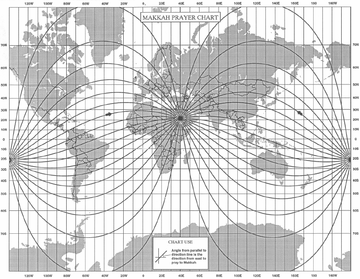 Lines of Equal Direction to Mecca on Mercator Projection. (